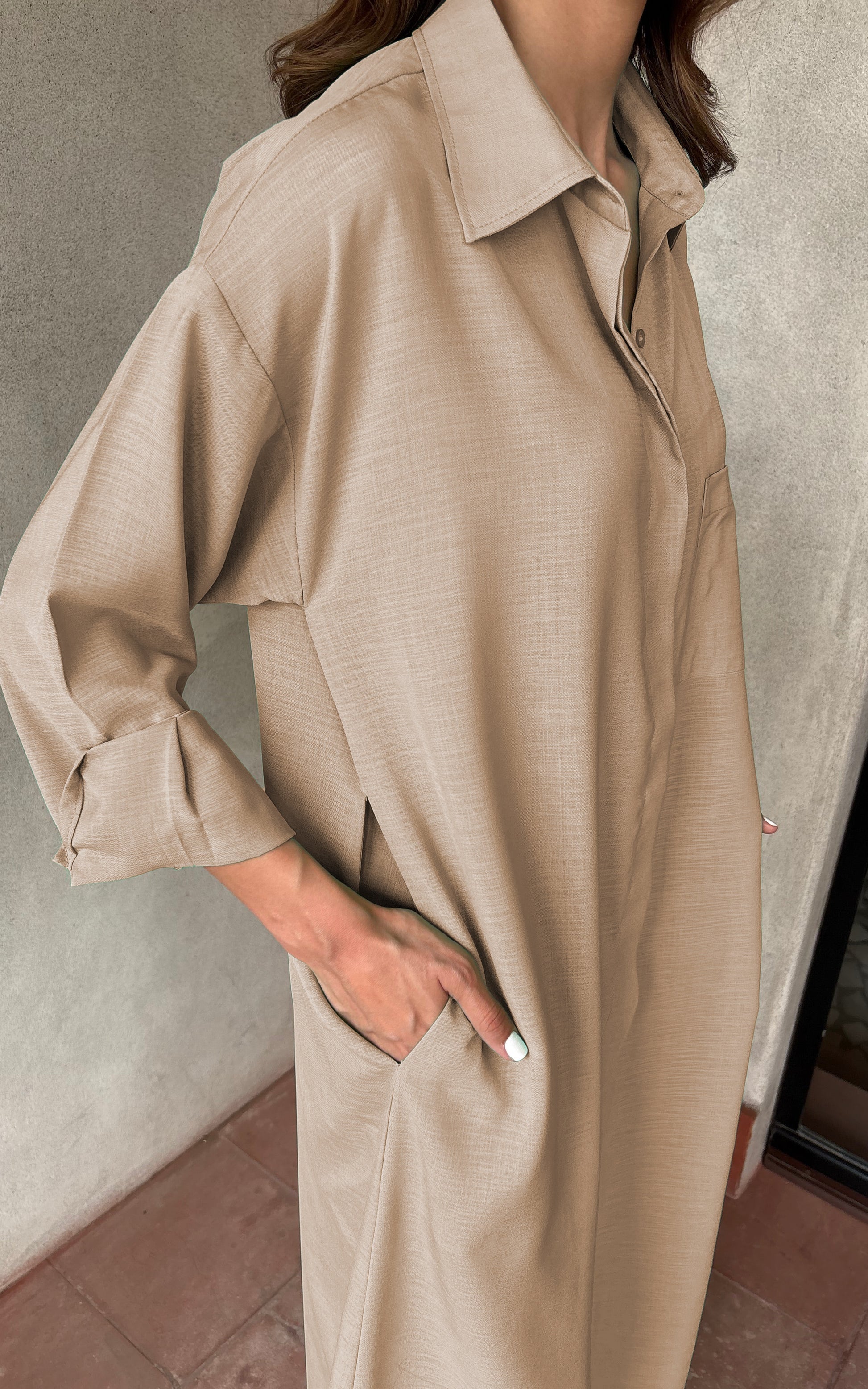 · Style: Minimalist shirt-collar kaftan with button-down detail